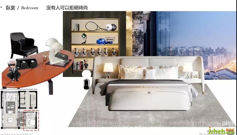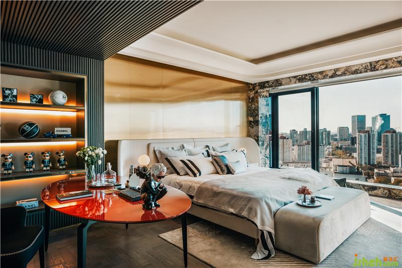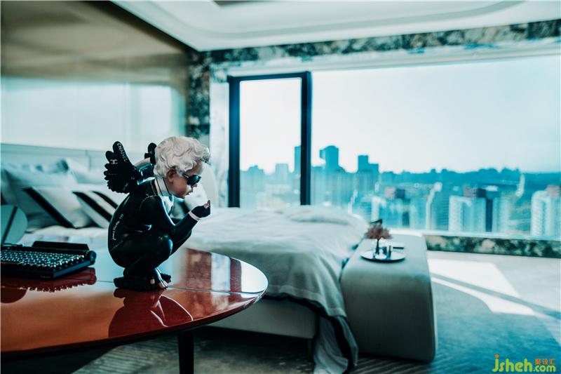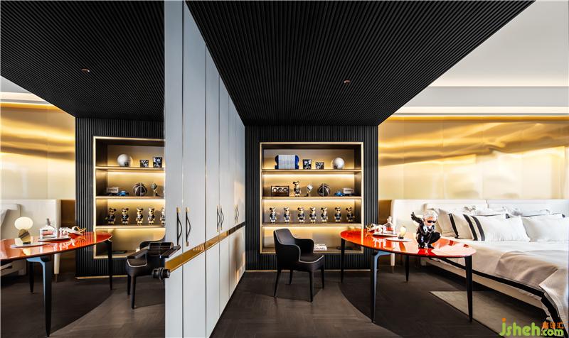 主臥套房以「老佛爺」卡爾·拉格斐為原型,呈現(xiàn)了一個活出豐滿獨(dú)立人格的傳奇人物的居室。壁柜上的香奈兒玩偶與陳設(shè)、書桌上以「老佛爺」為靈感的小型雕塑,鮮明地代出了這一空間的致敬主題。