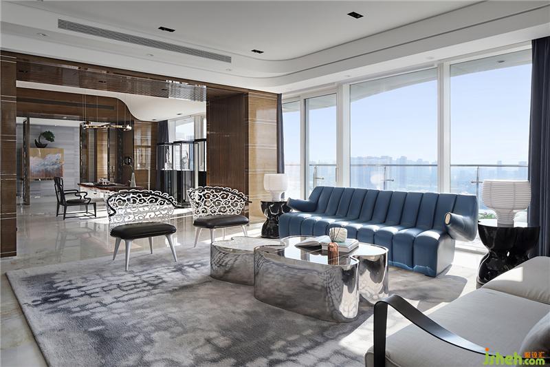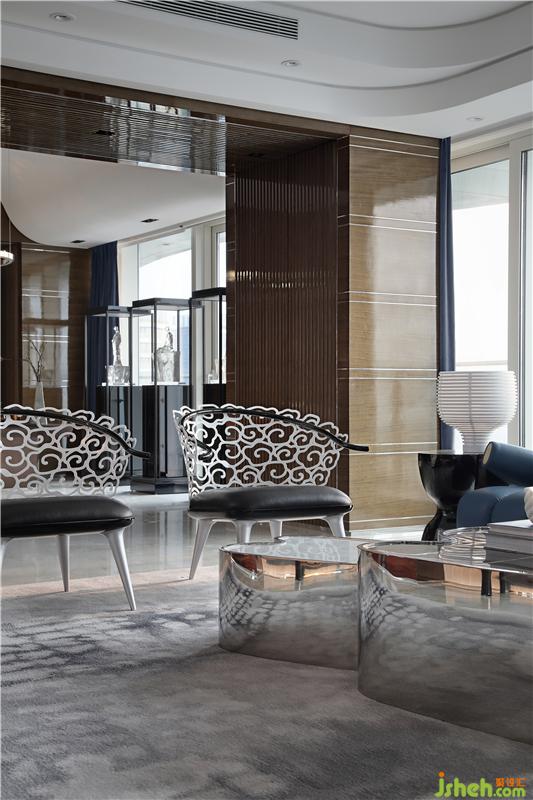 在“水之舞”的入口處,以德光居琺瑯漆柜作為開場,水墨畫般的琺瑯再嵌入優(yōu)美的的銅製金屬線條,線條延伸到Ceccotti雙人椅,猶如飛舞在五緣灣的光影之中;從玄關(guān)來到內(nèi)室,通透開放無區(qū)隔的多層空間雖帶來廣闊視野卻也容易造成層次的混亂,因此,邱德光先生使用了家具高低、落差與天花的壓縮與開放做出了區(qū)隔,使得整個空間通透卻又簡潔。