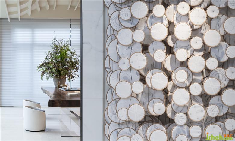 主要材料:雪花白石材、銀灰洞石橡木染灰、方管烤漆、亞克力、鍍鈦灰、黃銅、噴漆、壁紙、皮革
