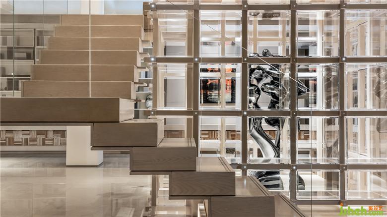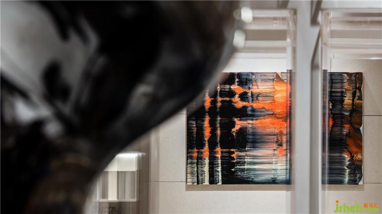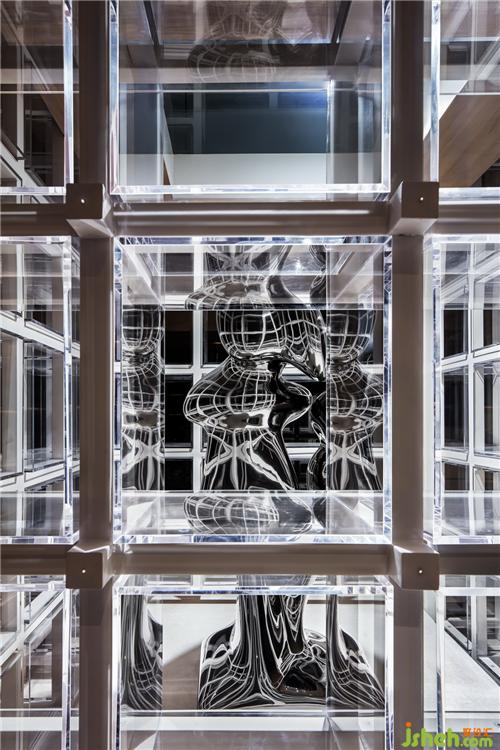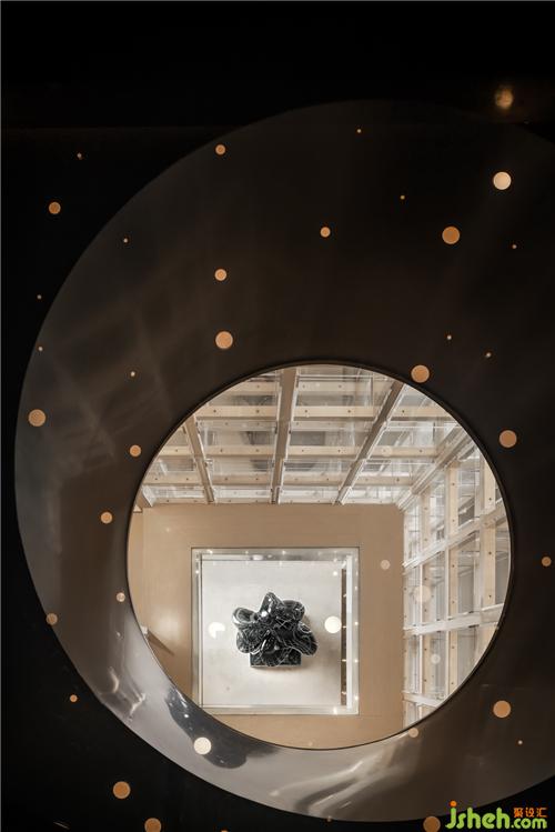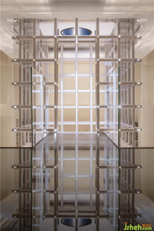 呈「十」字型搭接的內(nèi)心圣殿是對(duì)博古架、藏寶閣等的形態(tài)抽象演繹,置于空間軸心,以物質(zhì)的形態(tài)與空間橫縱相交軸線形成虛與實(shí)的對(duì)話?!甘?,這種極具儀式感的結(jié)構(gòu),連接著地上與地下、光與暗、虛與實(shí),譬喻著外物與內(nèi)在、自我與他者諸種關(guān)系的共融。