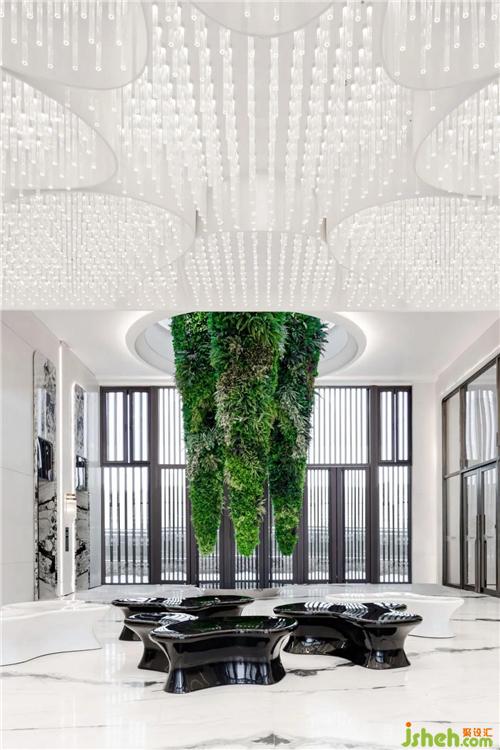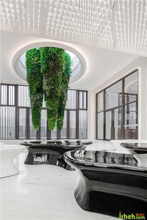 花瓣散落,在地面集聚成具備座椅功能的藝術裝置。黑與白并置,正如萬物的兩級彼此滲透、幻化,界限不清;其形態(tài)又似是泉匯而成潭、聚而成湖,將自然予人的喜悅與驚奇再現于會所的方寸之地。