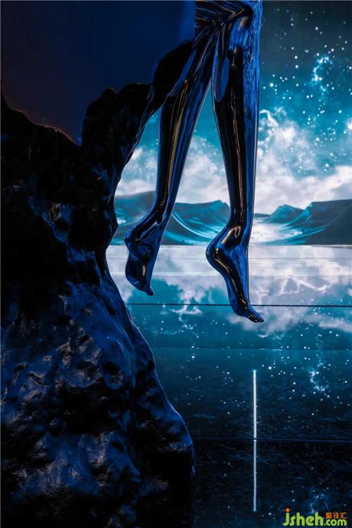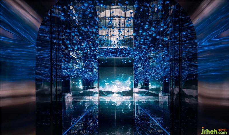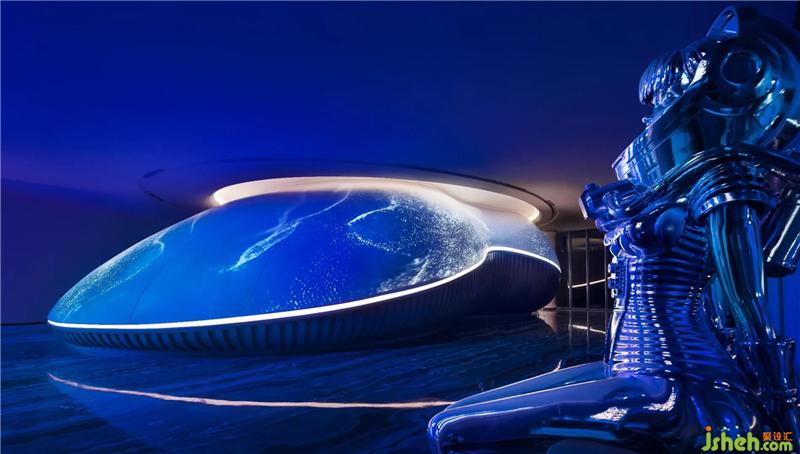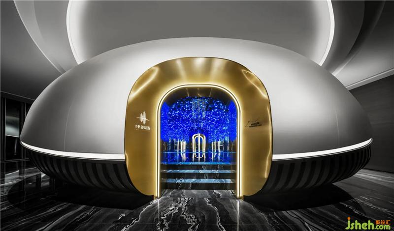 大約在30年前,Kevin Kelly(《連線》雜志主編)曾在《失控》一書中預判,稱「人造物表現(xiàn)得越來越像生命體;生命變得越來越工程化」。對待技術迅猛迭代,藝文界有人抱有一種「懷舊式」反感,又有人如KK般,將機器視作「我們的孩子」,一種獨立的生命存在形式。在東莞——一個以技術驅(qū)動的城市,技術自然而然地成為了設計與藝術的材料?!柑祀H」,則成為一座技與藝共塑的向上、向新的美學價值與精神價值的容器。門廳處,藝術家鄭路的藝術品《0000FF》成為整個空間「開宗明義」之句。它屬于藝術家《差翅亞目之目》(即,蜻蜓之眼)作品系列,是一只復眼,由6200個個體組成,猶如生命體,在閃爍、呼吸,是生物和機器的聯(lián)姻,是無機物和有機物相互嵌套的結(jié)果。它的「同宗」屬于沙漠、大?;虺鞘锌臻g,因進入室內(nèi),受限于對話和視看的方式而開啟一場「藝術進化」東莞售樓處設計。