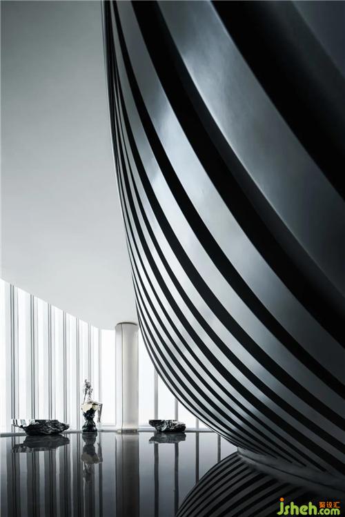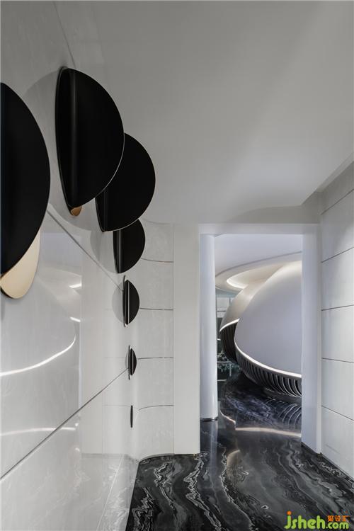 * 電梯廳丨墻面用黃銅材質,打造「月相」,將藝術融入空間;不遠處的「飛船」則是對空間藝術化更加完整的表述