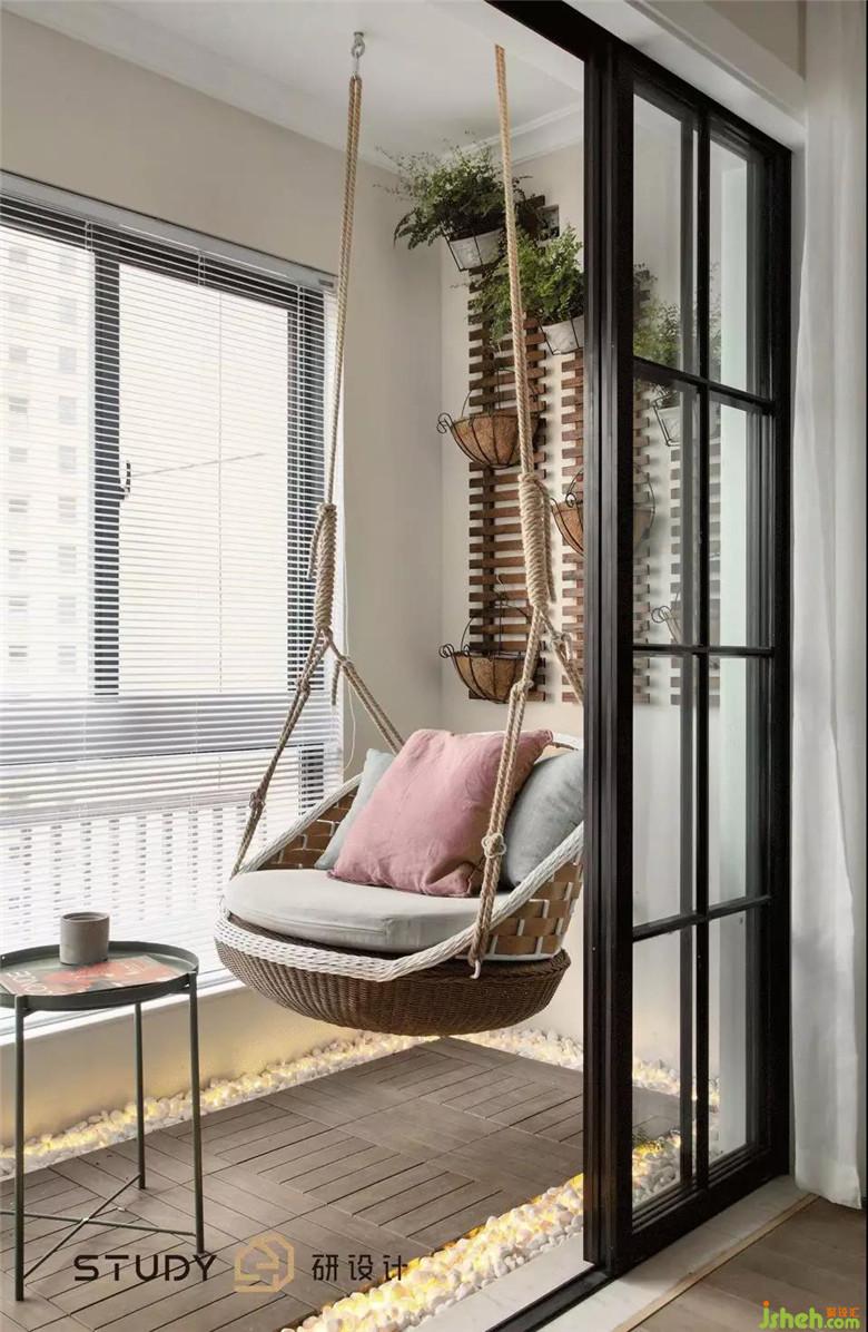 室內設計師在陽臺上使用了一張具有特色的吊椅,在這坐一下,能讓一整天的疲憊都消除掉。
