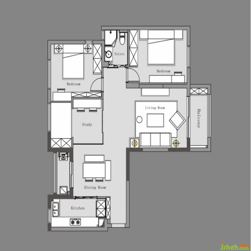 臥室的設計室內設計師保持了冷淡色的基調,黃色臺燈擺件點綴,簡單大方,讓睡眠空間保持相對獨立、安靜而私謐。