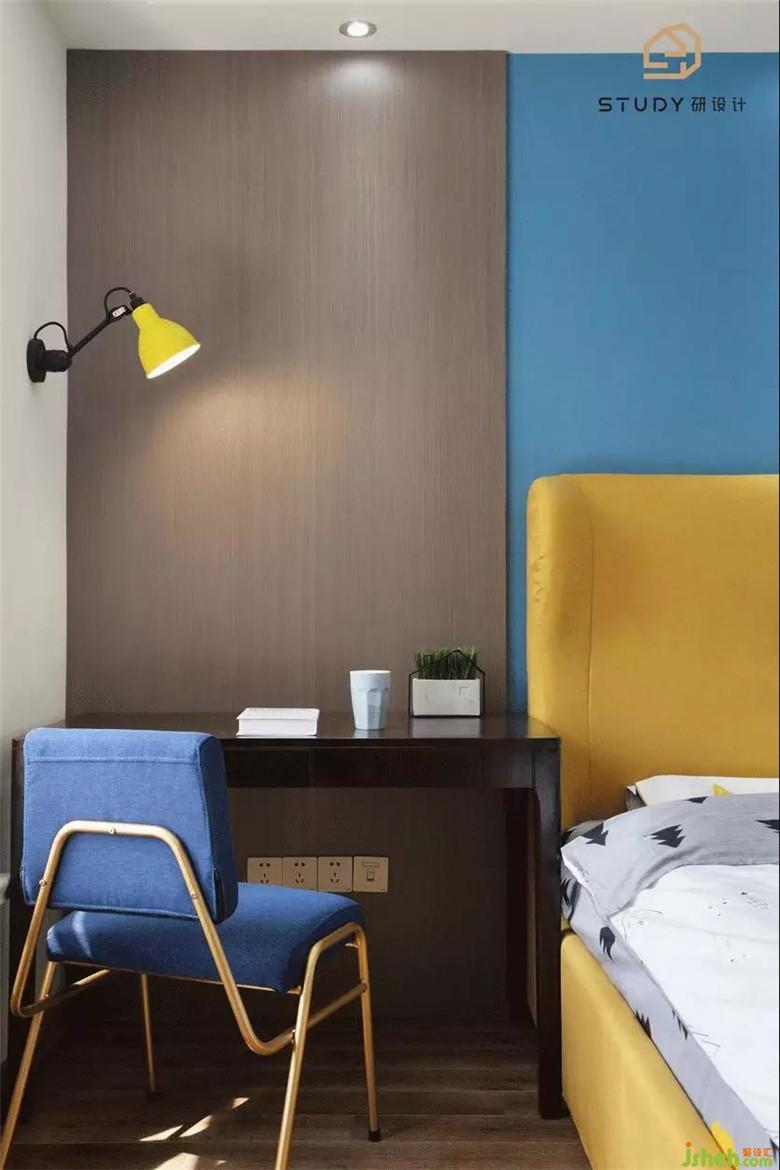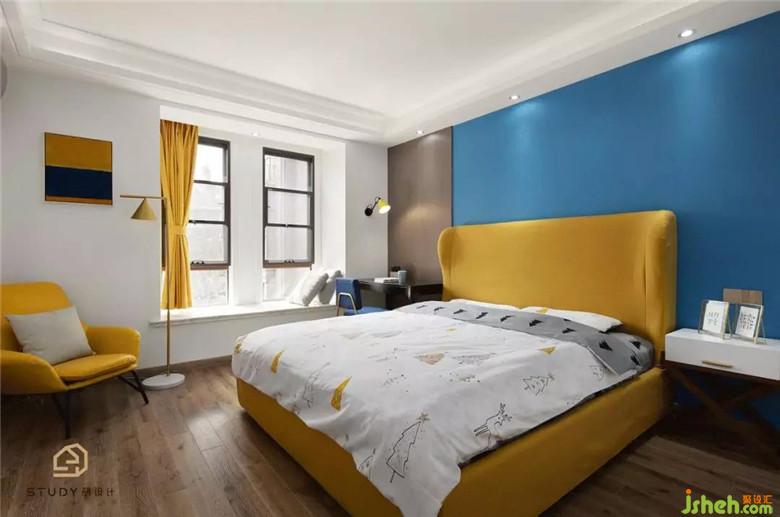臥室室內(nèi)設(shè)計(jì)師選用了藍(lán)色的壁紙作為背景色,而床就是用黃色的點(diǎn)綴,讓空間顯得溫柔,舒適。