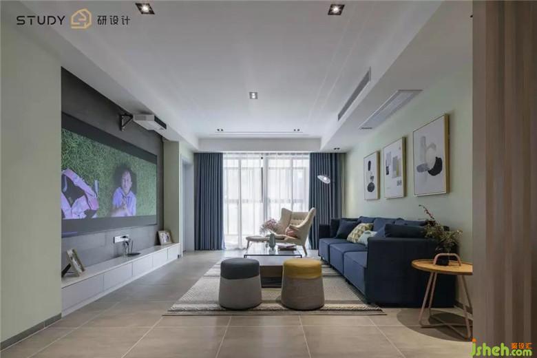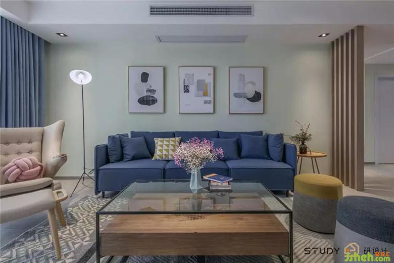 客廳作為待客區(qū)域,背景也以淺色為主,室內設計師在軟裝搭配和家具上體現(xiàn)的淋漓盡致??蛷d中間寬大的主沙發(fā)厚重、舒適,海軍藍作為主沙發(fā)色,也成為整個客廳的點睛色,鮮明有活力、有生命力。