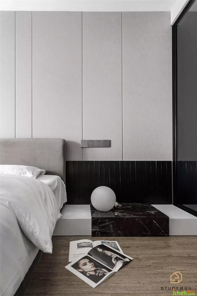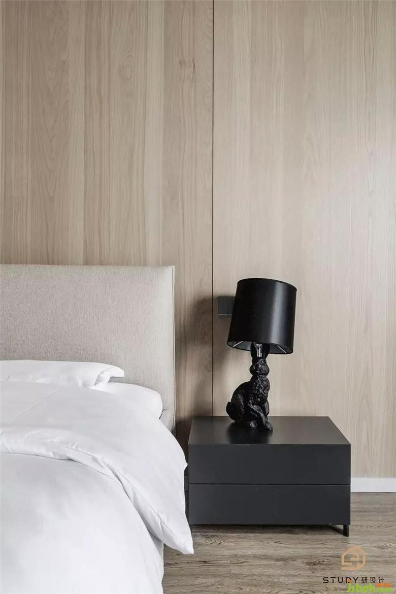 次臥室改變了原先呆板對稱的床頭造型,取而代之的是自帶溫柔屬性的天然木飾面,次臥室為父母居住,硬裝與軟裝家具使用的都是較為素雅的色彩與材質,室內設計師使整個空間更具浪漫舒適的溫情。