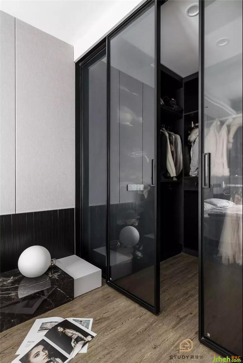 深灰色夾絲玻璃是在廣東定制并由本地拼裝生產,對于每一個材料細節(jié),都容不得將就,它與黑色定制衣柜的組合更像是一處秘境,勾引著初次見面的人去一探究竟。