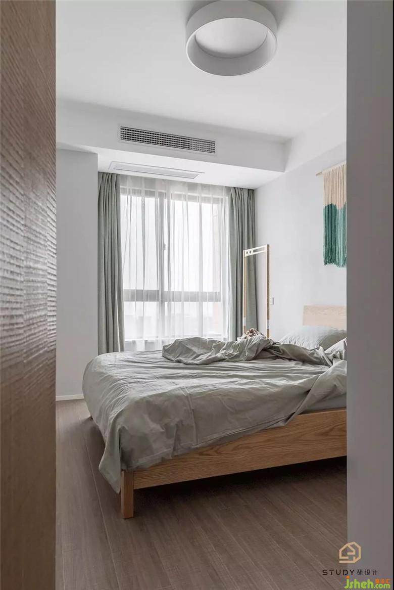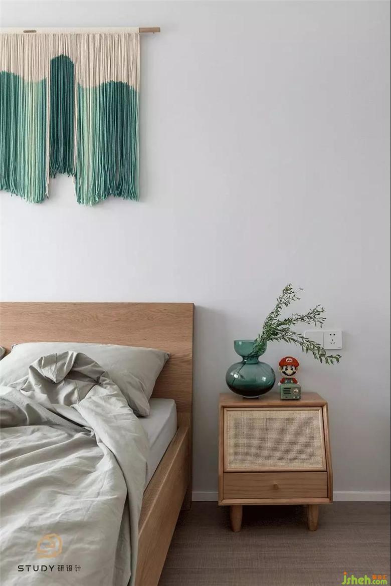 次臥室淺綠色窗簾與綠?掛毯清新?然,襯的整個空間淡妝輕抹,?掃夏?的煩悶,仿佛清涼的微?席卷著好?情撲??來。色彩上采??級且不暗沉的淺灰為底?,搭配暖潤的?質(zhì)床及床頭柜,調(diào)和出舒適宜?的?活?例。