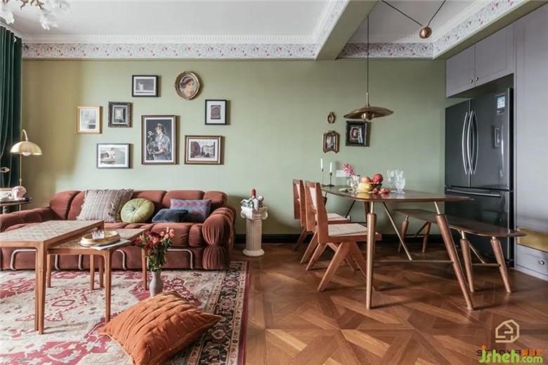藤編、黃銅、絨緞,還有頂面一圈野草莓花枝纏繞,這便是整個(gè)客餐廳的自然氣息,縈繞著治愈又復(fù)古的詩(shī)意,就這樣靜靜的呆在一起,無聊或打鬧,各自忙碌或者彼此擁抱,這小小的空間自由也浪漫。