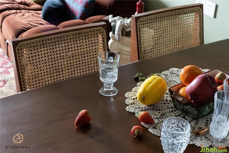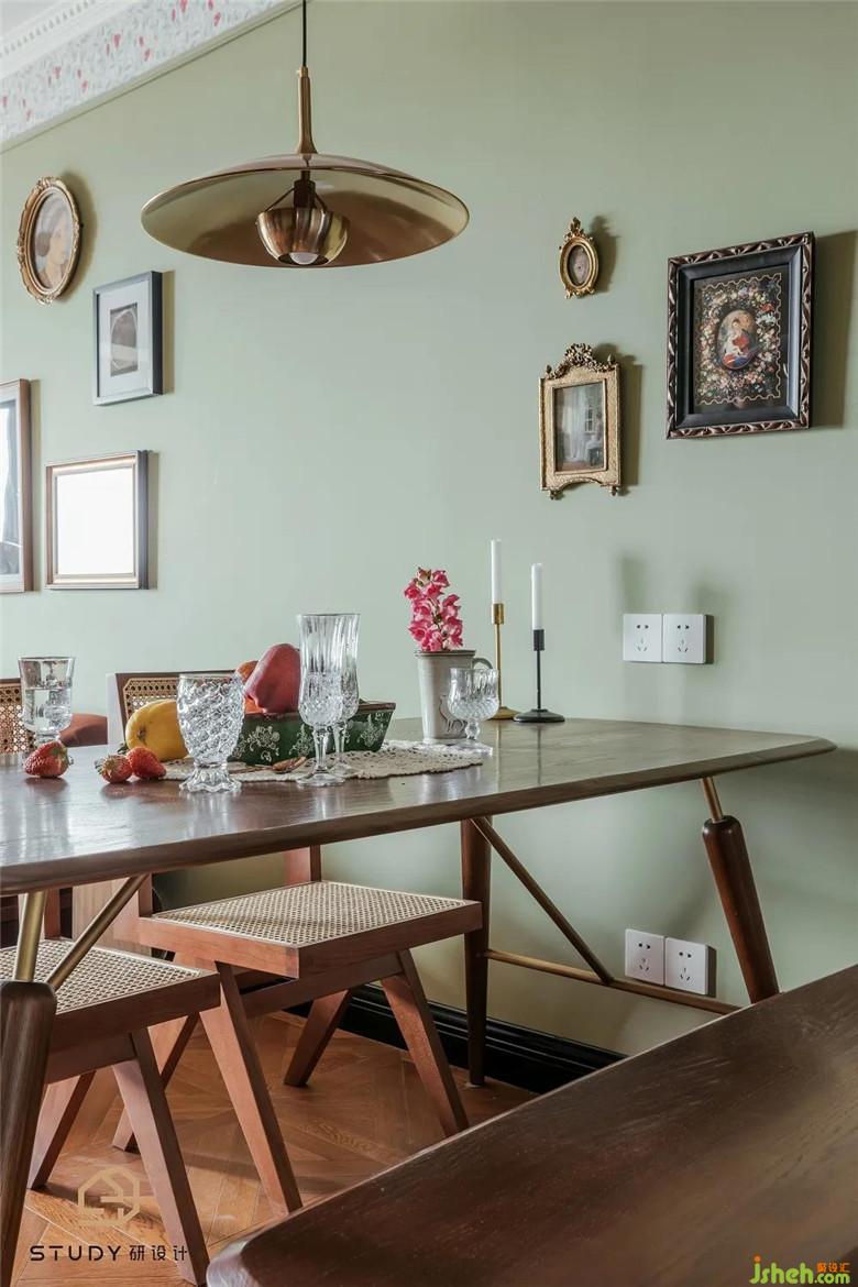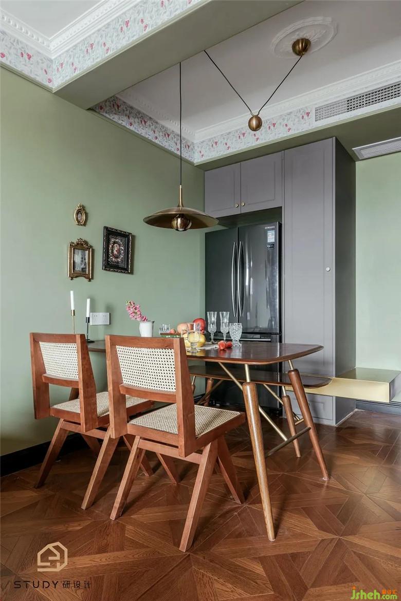 嵌入柜體中的冰箱,懸空的換鞋凳,入戶空間寬闊且實(shí)用。餐桌、藤編椅,溫潤的木色仿佛自帶生命力,不規(guī)則的吊燈充滿張力,復(fù)古拼花的木地板,把樂趣帶到地面。