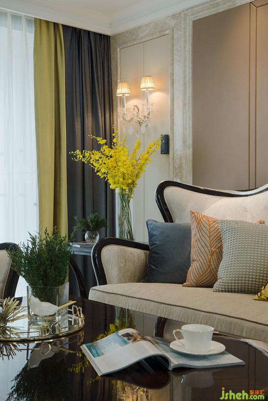 客廳小景,邊幾上的黃色植物和窗簾形成很好的呼應關(guān)系。