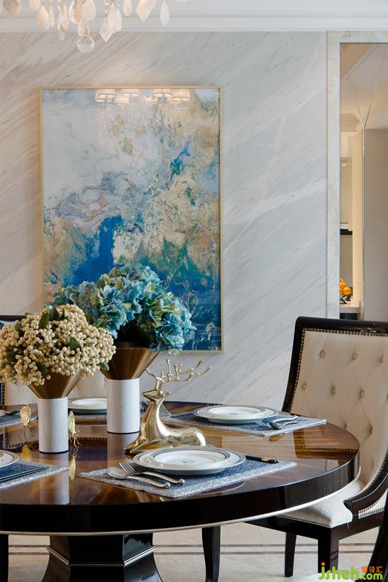 精致的原木印花餐桌,搭配典雅花紋的餐椅,懸吊的手工水晶燈飾下營造出溫暖的用餐氛圍。