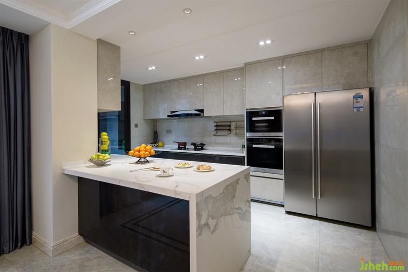 開放式的廚房新增設(shè)一座中島吧臺,不僅打造出多功能早餐吧,也增加料理工作臺面。