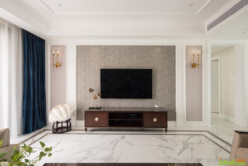 運營對稱的設計元素,強化電視主墻的儀式感,壁燈也起到了豐富空間光源的作用。