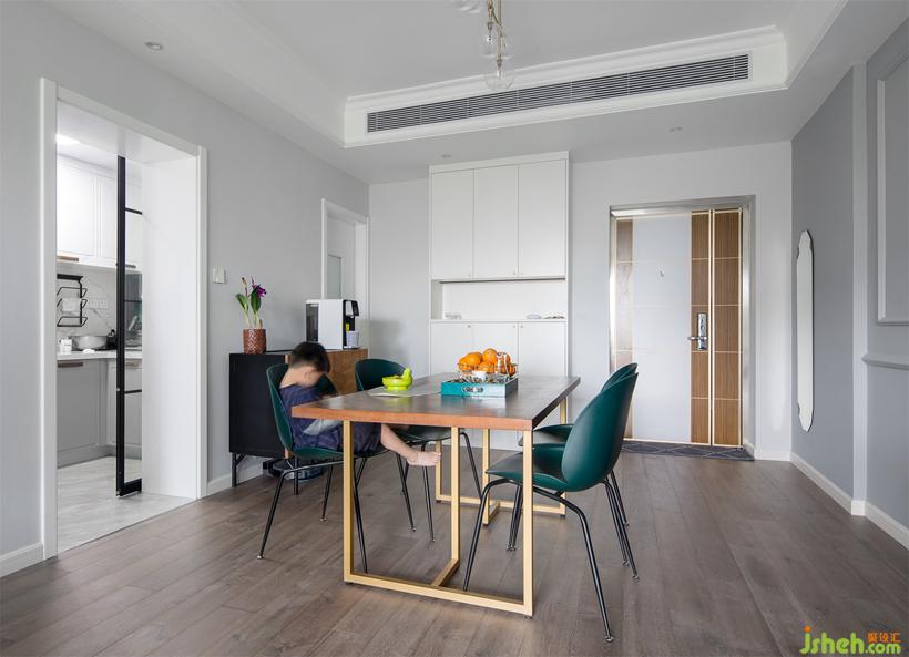 墨綠色餐椅吸引人的目光,現(xiàn)代感的銅色餐桌也同樣搶眼。設計公司