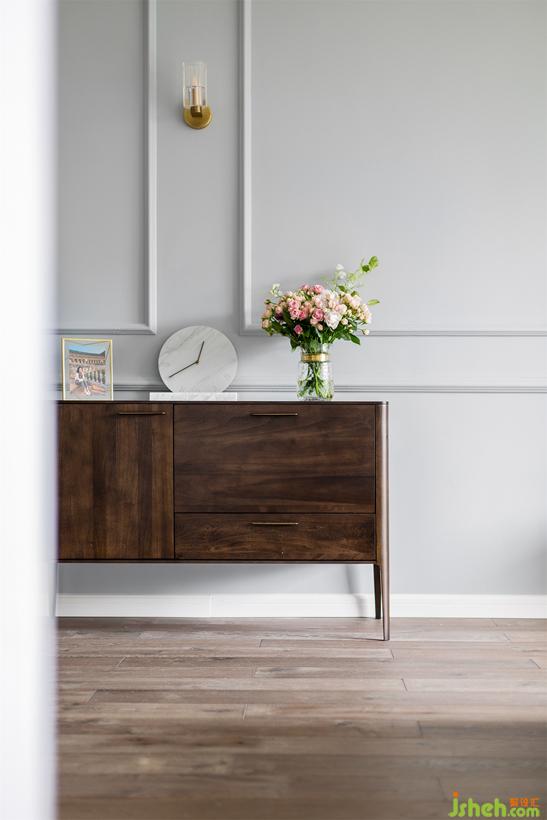 踏實的大地色系矮柜,淺淺的古典的線框、精致的容器裝著鮮花。方寸之間也可以蒔花弄草。