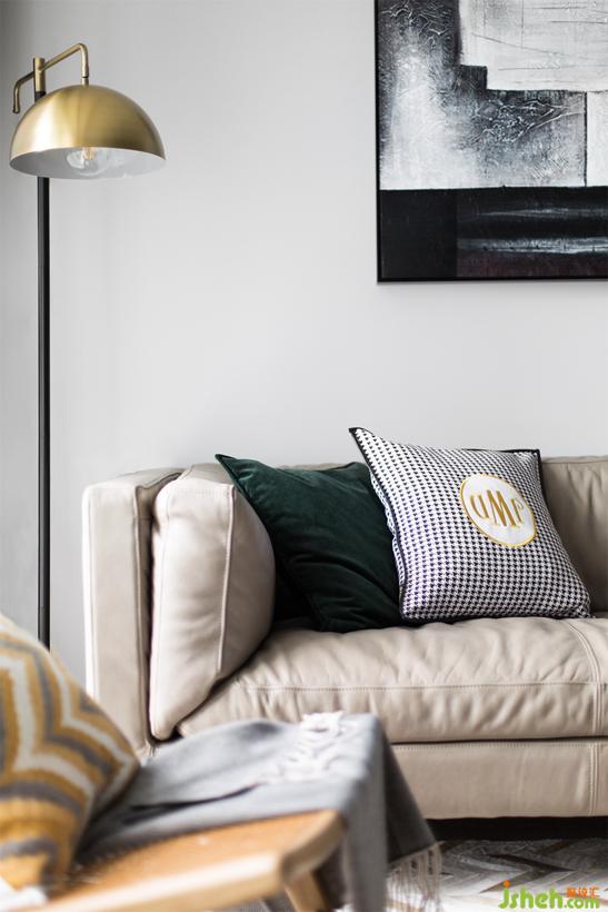 方便閱讀的孤傲銅色落地燈、優(yōu)雅實用的絨質(zhì)墨綠色抱枕、千鳥格的元素的加入。