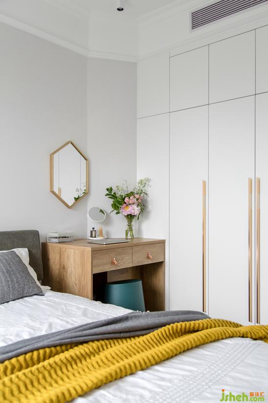衣柜選用金色把手配合白色柜門黑色細(xì)邊,不搶眼,也獨(dú)有韻味。定制梳妝臺(tái)和衣柜的配合很好吸納斜面的墻體。