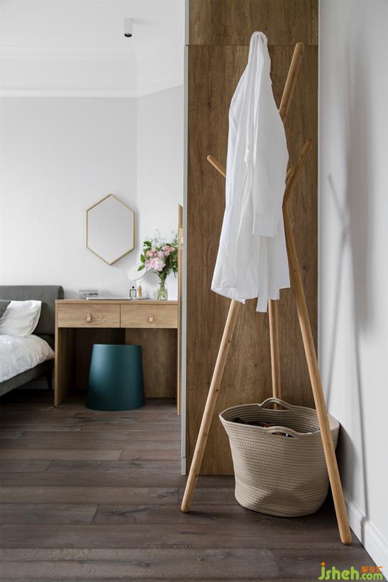 進(jìn)門處設(shè)置木質(zhì)掛衣架,與編織造型的收納籃??臻g和生活機(jī)能有關(guān)系,有隨意放置物品的地方,整合屋主的收納習(xí)慣。