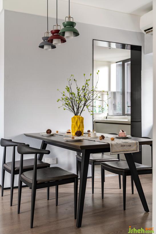 墻面黑色的壁燈, 與鐵制餐桌椅。給無力感的灰色增加一些重量。