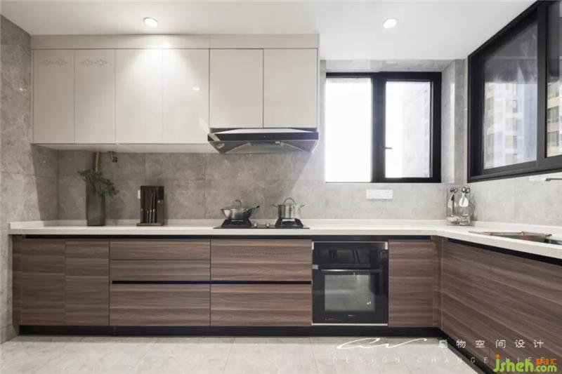 原廚房僅有的一扇窗戶,不足以支撐大廚房的采光。我們將與陽臺接壤的墻面重新開拓出新窗。才得到現(xiàn)在的明亮感,木色的橫紋與黑色元素帶出硬朗的極簡氛圍。右側(cè)冰箱還未入場。