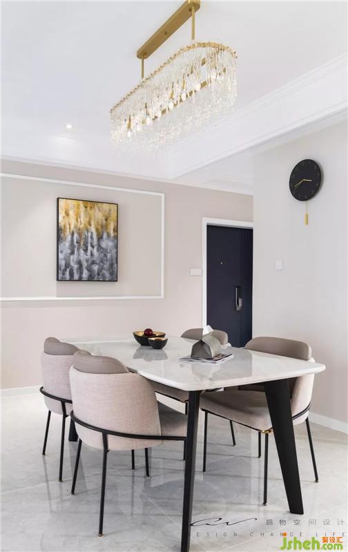 吊燈的璀璨與掛畫的斑斕一脈相承,金色是他們共有的語匯。在墻上的掛鐘,在桌上的果盤,在餐椅的腿上。裝修設(shè)計