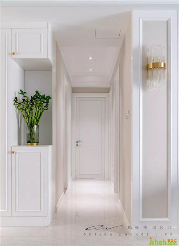 過道的柜特意留出空位,線框的帶來儀式感。天花并沒有吊平處理,而是延承客餐廳的的造型。裝修設(shè)計