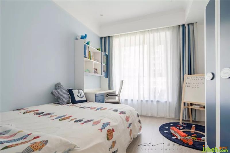 墻面的藍白拼色,窗簾,衣柜,透露出童趣。有點違和的書桌椅是sheerry刻意為之,這里不要太舒服,寫作業(yè)時就認真寫。房間格局調(diào)整后,空出鋼琴位,現(xiàn)在淪為小男孩的玩耍區(qū)。實現(xiàn)一張一弛的平衡。