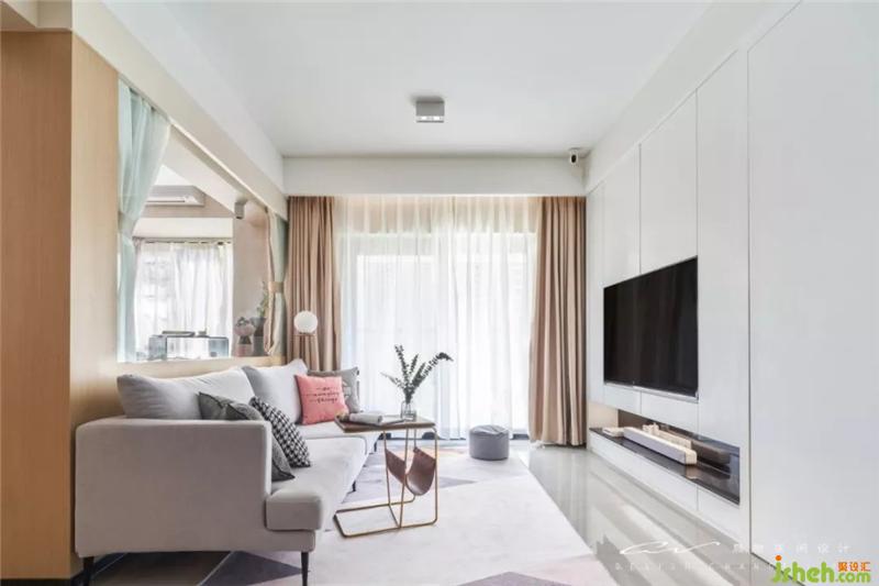 沙發(fā)挑了很久才找到尺寸剛剛好的,灰色的布料,串聯(lián)地毯的灰調(diào),再用一塊粉色妝點(diǎn)活潑。裝修設(shè)計(jì)