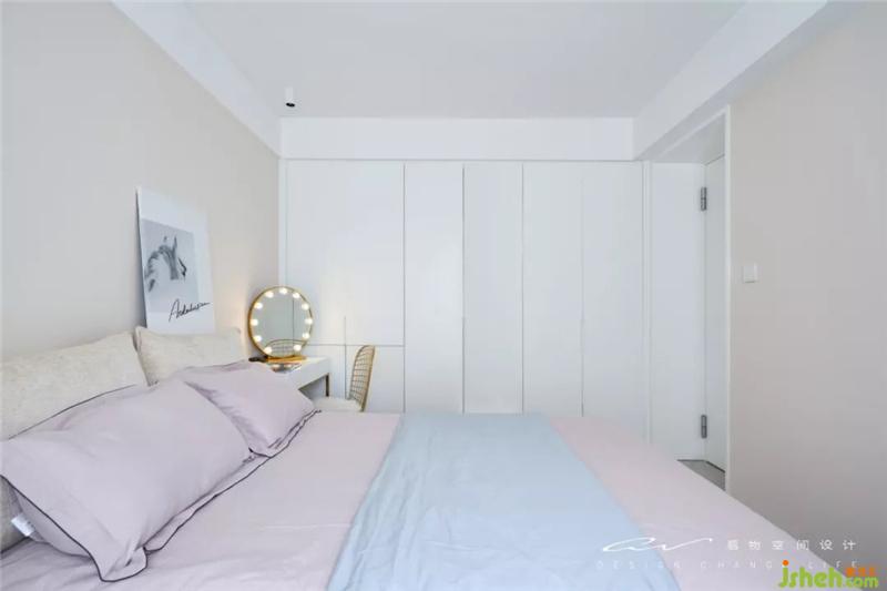 藕粉色的床品,搭配霧藍(lán)色的蓋毯,溫姐粉色的心大滿足。梳妝臺是網(wǎng)紅款。