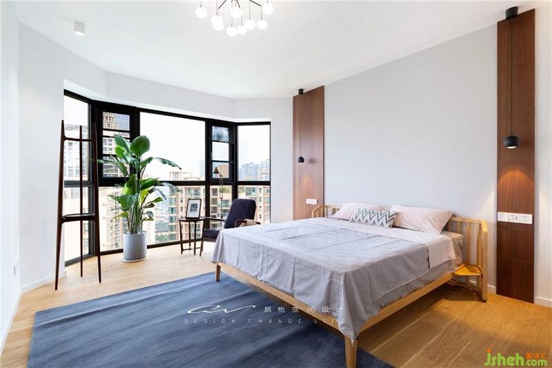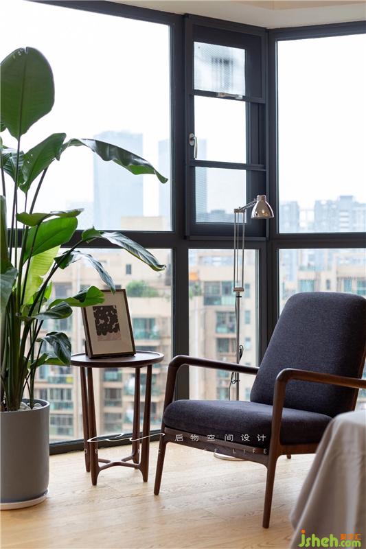 床頭,木飾面被燈光照得生動?;⌒未胺胖镁G植,坐在幾椅上靜靜欣賞窗外的風(fēng)景。裝修設(shè)計