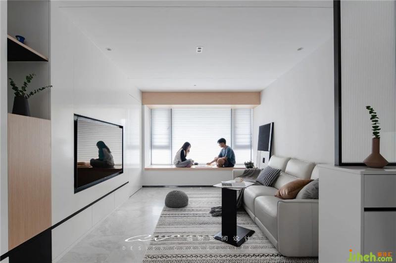 入戶第一眼是無壓感的空間。白色很難做出層次及距離感,因此小戶型慎用?。ň拖癜咨澴诱l穿誰胖一樣,白色是有膨脹感的顏色。)這里用天花線條拉長(zhǎng)視覺縱深,用電視墻做中景拉開距離,做出視覺差異空間才會(huì)顯大。裝修設(shè)計(jì)