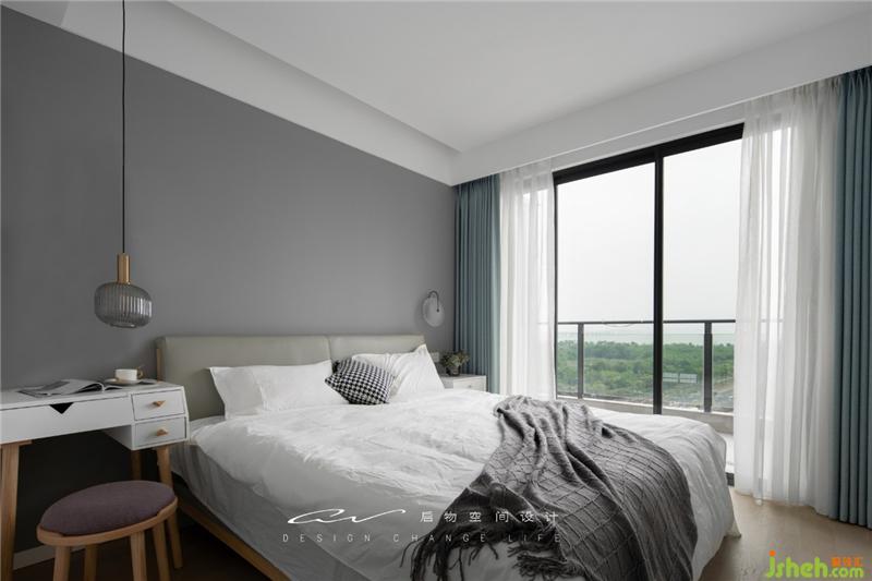 來到主臥,透過全景大落地窗,一眼望去,山與海的景色映入眼底,仿佛室外的綠色是一幅巨型裝飾畫,給溫馨舒適的主臥增添生機。
