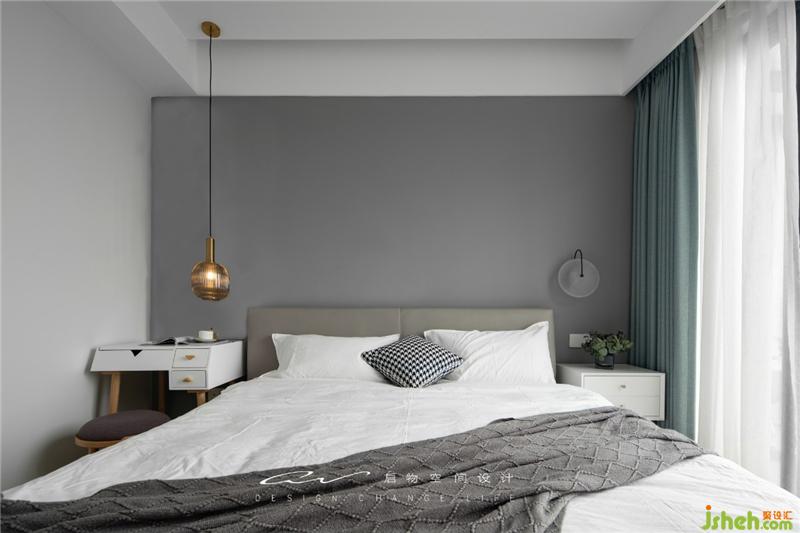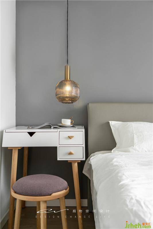 臥室床頭配了MINI梳妝臺。一個金屬質(zhì)感的吊燈,搭配一個黑桿玻璃壁燈個性又時尚!