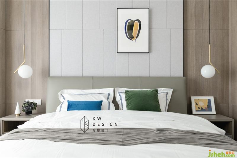 主臥用對稱的手法表達(dá)秩序感。設(shè)計(jì)細(xì)節(jié)在硬包縫與木飾面接縫的齊整。