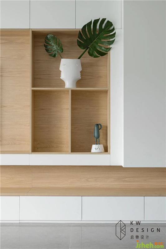 開放式層架,除了收納功能,層板深度拉深至30公分,讓貓咪可在墻面安全自在游走。獨(dú)具創(chuàng)意的人臉裝飾花瓶插上仿真龜背葉,主人喜愛的藍(lán)綠色萌動(dòng)企鵝,還有和背景融為一體的貓小灰,為這個(gè)空間帶來了趣味性和想象力。