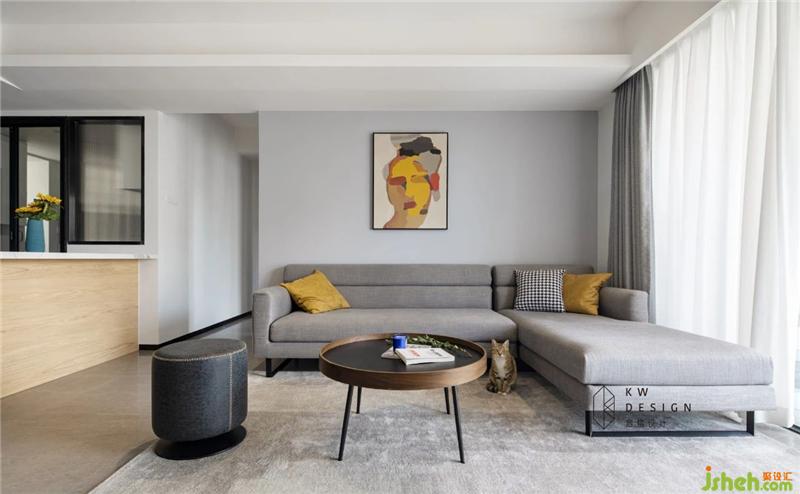 中性色彩有效沉淀空間情緒,各種質(zhì)感的灰,棉麻的,絨面的,織面的,搭配以淺藍(lán)色鋪陳的背景,抽象的藝術(shù)彩色掛畫,為屋主提供了一個(gè)舒壓明亮的開放空間。