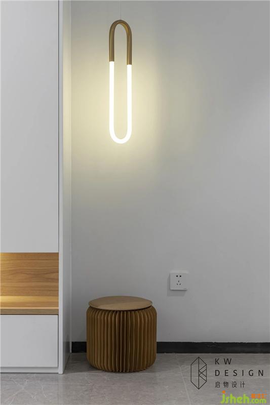 進(jìn)門處的牛皮折疊圓凳,U型創(chuàng)意吊燈,弱化了電視柜厚度,讓通透開闊的休閑空間盡收眼底。