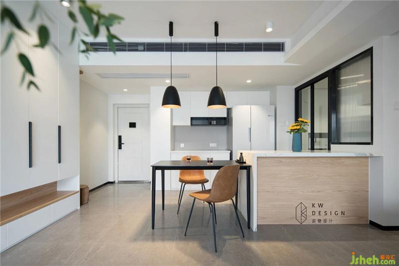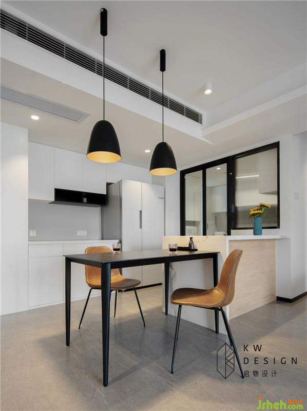 不規(guī)則灰色紋理的雪花白巖板吧臺(tái),和規(guī)則金色紋理的黑色巖板餐桌形成了強(qiáng)烈的視覺對(duì)比,棕色皮質(zhì)餐椅搭配簡(jiǎn)約黑色吊燈,為熱愛生活的主人提供一處滿足味蕾和觸覺的溫馨舒適小天地。室內(nèi)設(shè)計(jì)師