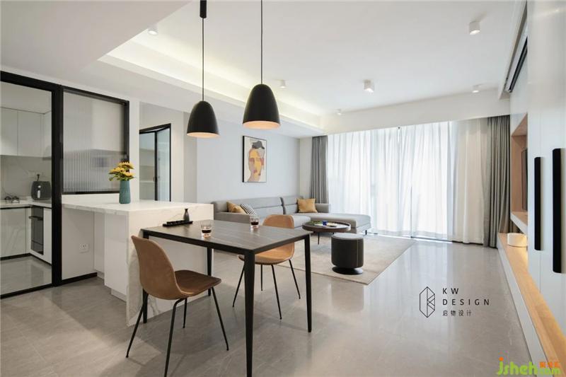 進(jìn)門左邊是到頂鞋柜與餐邊柜的結(jié)合,餐邊柜墻面刷了淺灰色乳膠漆做空間的功能區(qū)分,黑色開放格增加了立面層次感。室內(nèi)設(shè)計(jì)師