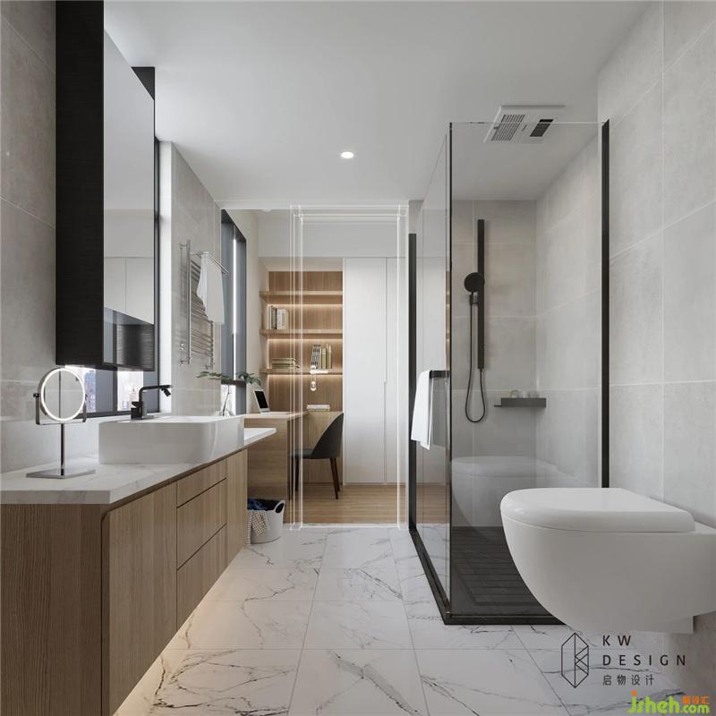 和主衛(wèi)風格色調(diào)統(tǒng)一。與其他空間暖色調(diào)形式對比,衛(wèi)浴空間采用冷色調(diào)給人以冷靜平和的身心感受。室內(nèi)設計師