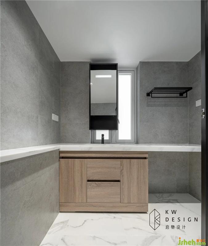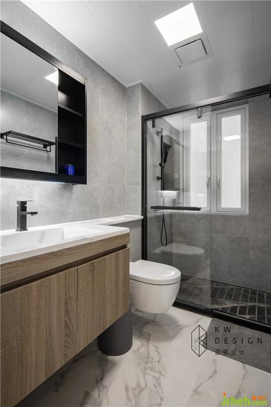 主衛(wèi)延用整體空間白灰色調(diào)搭配不同木色和不同質(zhì)感的黑色打造整潔舒適的洗浴空間。