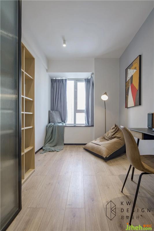 活動式書柜和書桌是短時間內(nèi)男屋主碼代碼工作的地方,懶人沙發(fā)和落地吊燈可以給另一半看書發(fā)呆。窗臺同時也是貓咪欣賞窗外景色的地方。兩人兩貓的時光,愜意美滿?;顒邮郊揖叻奖阄葜魑磥砜梢愿鶕?jù)不同需求改造客房或者兒童房。