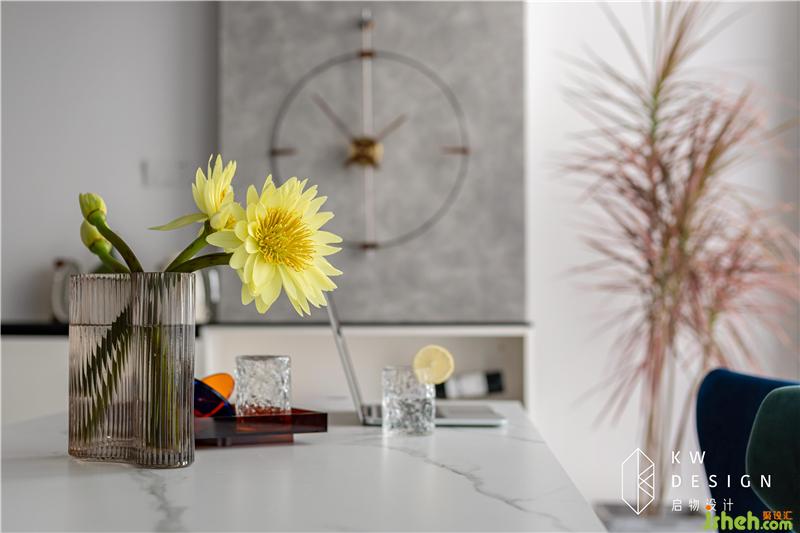 靠玄關(guān)的墻原本設(shè)計的是一整排柜子,防止壓抑改成了一排懸空的矮柜,簡單收納,室內(nèi)設(shè)計師更多的會考慮美觀,裝飾的作用,巖板柜面,不僅高級還具備倒影的美感。