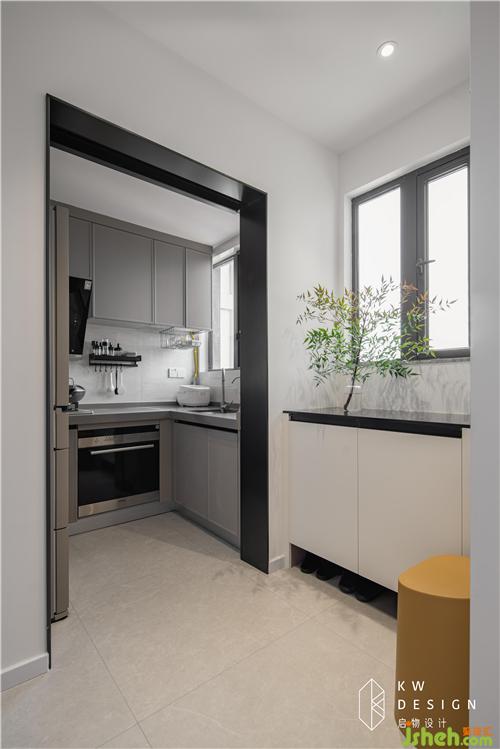 1:完善廚房順暢的洗切炒功能,留給玄關(guān)輕便的收納和擺設(shè)功能。