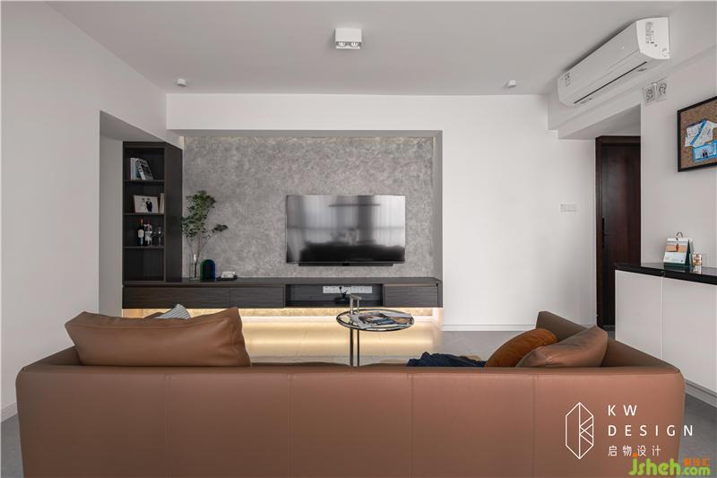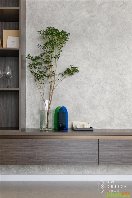 凹陷的電視背景視覺拉遠(yuǎn),給予舒適的視聽感受。電視位置進(jìn)行了充分考慮,中線位置離地面一米左右。橫梁下煙熏灰的展示邊柜及電視底柜與藝術(shù)漆背景形成一個自然展示區(qū)域。