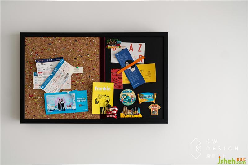 軟木板掛飾給整個空間添上了多彩吸睛的一筆,其后遮擋住了電表箱。日常釘上旅行后保留的機(jī)票,景點(diǎn)門票,明信片等,是家里溫情的一筆。忙碌的日常生活在這些美好回憶的存留下有了幾分生活明朗,萬物可愛,來日可期的意味。