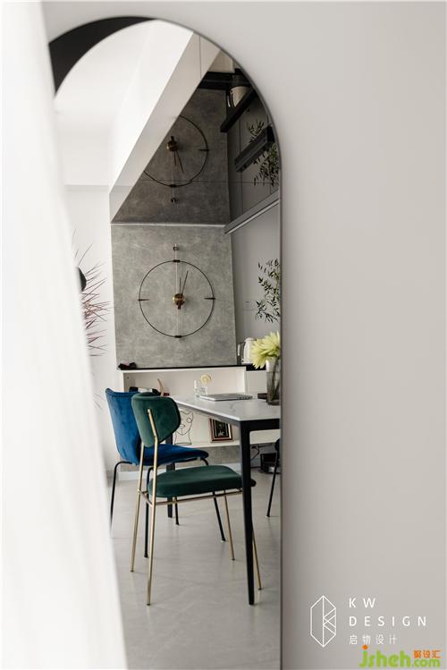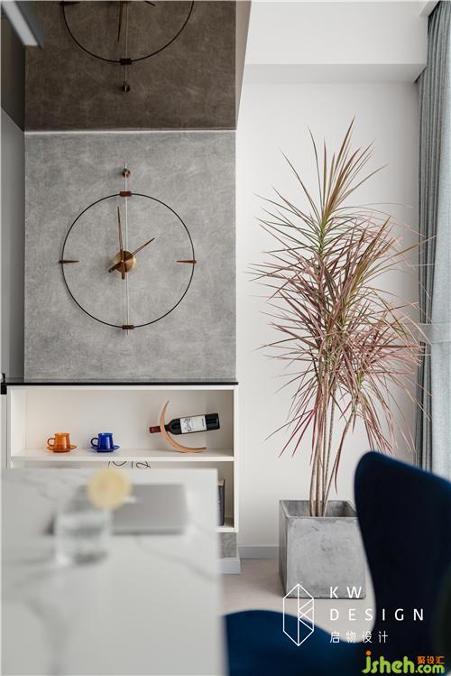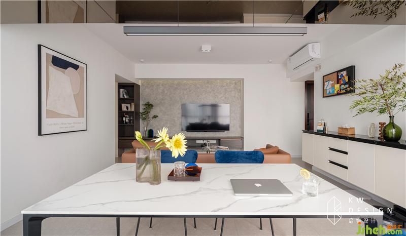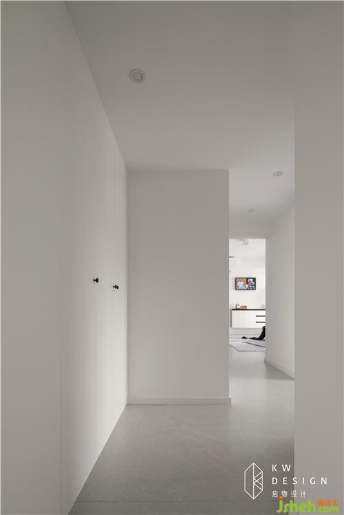 從主臥出來往客廳望去,寬闊狹長的走廊不僅擁有全屋的集中隱藏式收納柜,而且留白式設計非常具有藝術走廊的美感是室內(nèi)設計師的最愛。